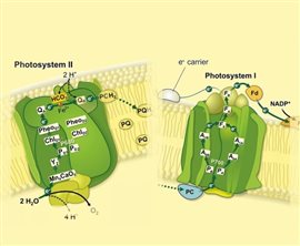 光合作用高效的吸能、傳能、轉(zhuǎn)能過程是在光合膜上具有一定分子排列空間構(gòu)象的色素蛋白復(fù)合體上進(jìn)行的,并在10-15秒至10-7秒內(nèi)完成。整合于光合膜上的色素蛋白復(fù)合物根據(jù)功能通常分為:光系統(tǒng)I(PSI)、光系統(tǒng)II(PSII)、Cytb6f復(fù)合物以及ATP合成酶復(fù)合物。在這4個(gè)色素蛋白復(fù)合體共同參與下,光合作用的光反應(yīng)完成電子從H2O到NADP+的傳遞并產(chǎn)生ATP和釋放O2。PSI和PSII是生物光能轉(zhuǎn)換的重要場(chǎng)所,涉及水裂解放氧反應(yīng)和原初電荷分離等關(guān)鍵步驟,是決定光合作用效率的重要部位。