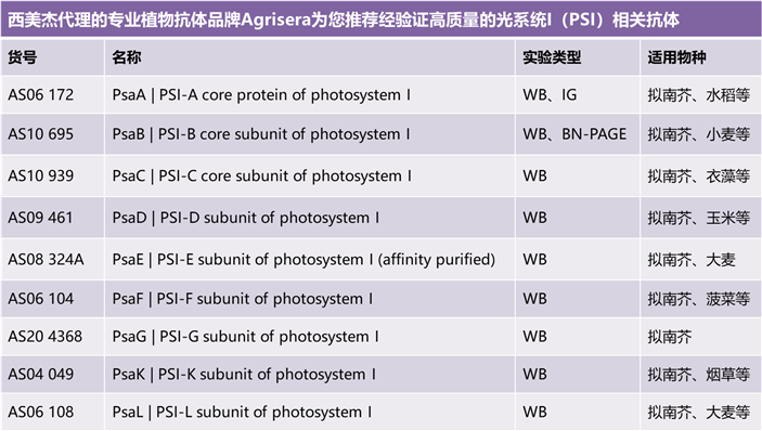 - 促銷產(chǎn)品:除上述小編列舉的抗體外,更有60多種光系統(tǒng)PSI和PSII相關(guān)抗體正在進(jìn)行促銷,請(qǐng)見促銷產(chǎn)品清單 點(diǎn)擊下載。