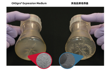 CHOgro? High Yield Expression System中的另一關(guān)鍵組分CHOgro? Expression Medium,也是提升CHO細(xì)胞蛋白/抗體表達(dá)量的重要因素。細(xì)胞的生長狀態(tài)、是否結(jié)團(tuán)、細(xì)胞密度等都是評估CHO細(xì)胞培養(yǎng)基的關(guān)鍵參數(shù)。