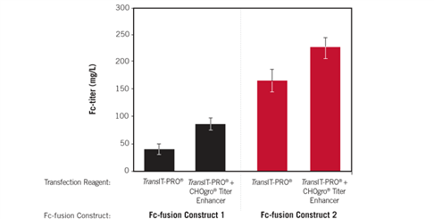 圖1. 單獨使用Mirus CHOgro? High Yield Expression系統(tǒng)中的轉(zhuǎn)染試劑(TransIT-PRO? 轉(zhuǎn)染試劑),也有著高水平的轉(zhuǎn)染效率。