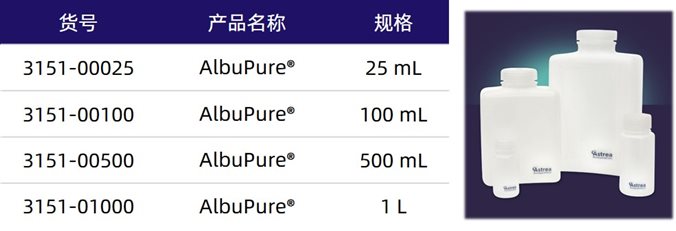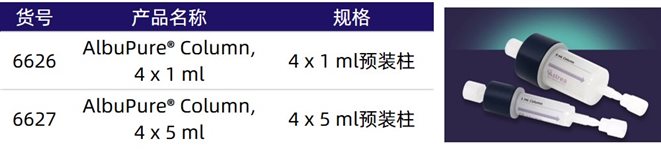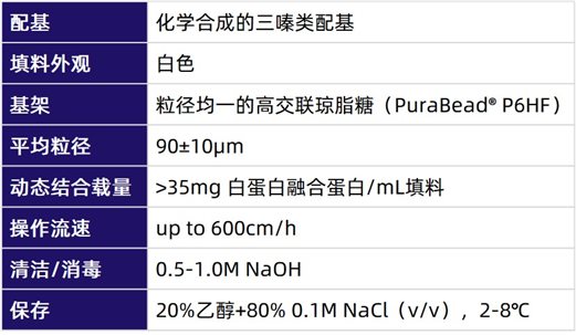 AlbuPure®是Astrea Bioseparations和Albumedix公司合作開發(fā)的白蛋白親和層析填料,填料基架是粒徑均一的高交聯(lián)瓊脂糖,配基是合成的三嗪化合物,具體高流速、高動態(tài)結(jié)合載量、強(qiáng)化學(xué)耐受性等特點(diǎn),主要用于白蛋白融合蛋白的純化。AlbuPure®的性能參數(shù)如下表所示。