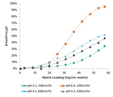 AlbuPure®具有卓越的白蛋白融合蛋白結(jié)合性能,如圖4所示,研究人員在不同pH值不同流速的上樣條件下,探究了AlbuPure®對scFv-rHSA的動態(tài)結(jié)合載量,結(jié)果表明,在pH=4.5,240cm/h線性流速下,AlbuPure®對目標(biāo)融合蛋白的動態(tài)結(jié)合載量最佳,10%流穿時(shí),載量高達(dá)38.4mg/mL。