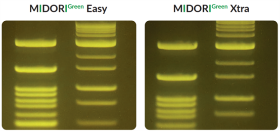 圖3:使用MIDORI Green Xtra檢測的DNA條帶具有超高靈敏度(注:左圖使用藍(lán)色/綠色 LED 透射儀進(jìn)行檢測;右圖使用藍(lán)色LED透射儀進(jìn)行檢測。)
