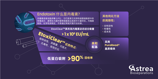 本文將推薦一款來自英國Astrea Bioseparations的Etoxiclear?層析介質(zhì),它是一種高性能、非離子交換、合成的親和層析吸附劑,可經(jīng)濟(jì)高效地去除內(nèi)毒素,支持GMP生產(chǎn),有凝膠和一次性預(yù)裝柱兩種形式產(chǎn)品,滿足不同的工藝需求。