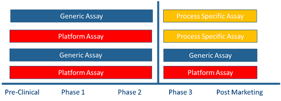 美國藥典USP<1132>和歐洲藥典EP2.6.34. HOST-CELL PROTEIN ASSAYS將HCPs檢測方法分為:商業(yè)化試劑盒、產(chǎn)品/工藝專屬性方法和平臺化方法。并指出在產(chǎn)品開發(fā)的不同階段,推薦采用不同的ELISA試劑盒用于HCPs的檢測。