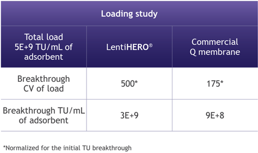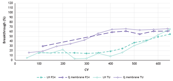 下圖是VSV-G LVV樣品在不同流速下通過LentiHERO(LH)與Q膜流穿液的TU和p24檢測結果,LentiHERO對LVV的結合能力顯著高于Q膜。由此表明,LeniHERO在LVV流穿之前能夠處理更大體積的料液。