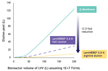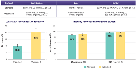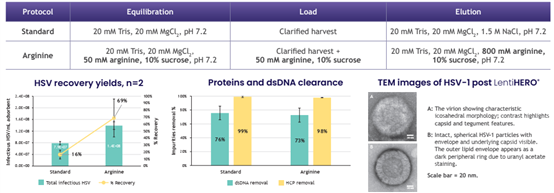 用0.8M精氨酸洗脫,HSV回收率可達到69%,LentiHERO®載量可達1.4E+8 IU/ml,同時實現(xiàn)高效的雜質去除。