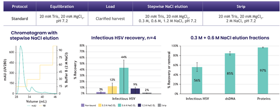 感染性HSV回收率為56%,LentiHERO®載量可達9.2E+9 IU/ml,大部分感染性HSV在0.6M NaCl條件下被洗脫。