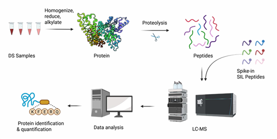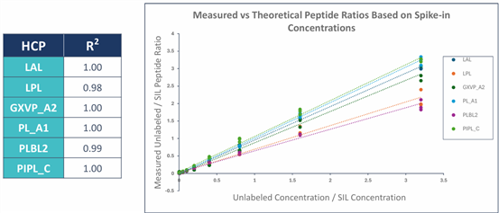 ELISA HCP檢測方法雖能評(píng)估總體HCP水平,但無法識(shí)別具體種類的脂肪酶,難以對(duì)工藝相關(guān)風(fēng)險(xiǎn)進(jìn)行精準(zhǔn)評(píng)估。為解決這一問題,Cygnus Technologies開發(fā)了基于液相色譜-串聯(lián)質(zhì)譜(LC-MS/MS)的靶向蛋白質(zhì)組學(xué)分析方法(CHO 6xLipase? MS Assay)。該方法采用平行反應(yīng)監(jiān)測(PRM)技術(shù)和穩(wěn)定同位素標(biāo)記肽段(SIL),實(shí)現(xiàn)對(duì)可以引起吐溫降解的六種CHO來源HCP脂肪酶的絕對(duì)定量:
