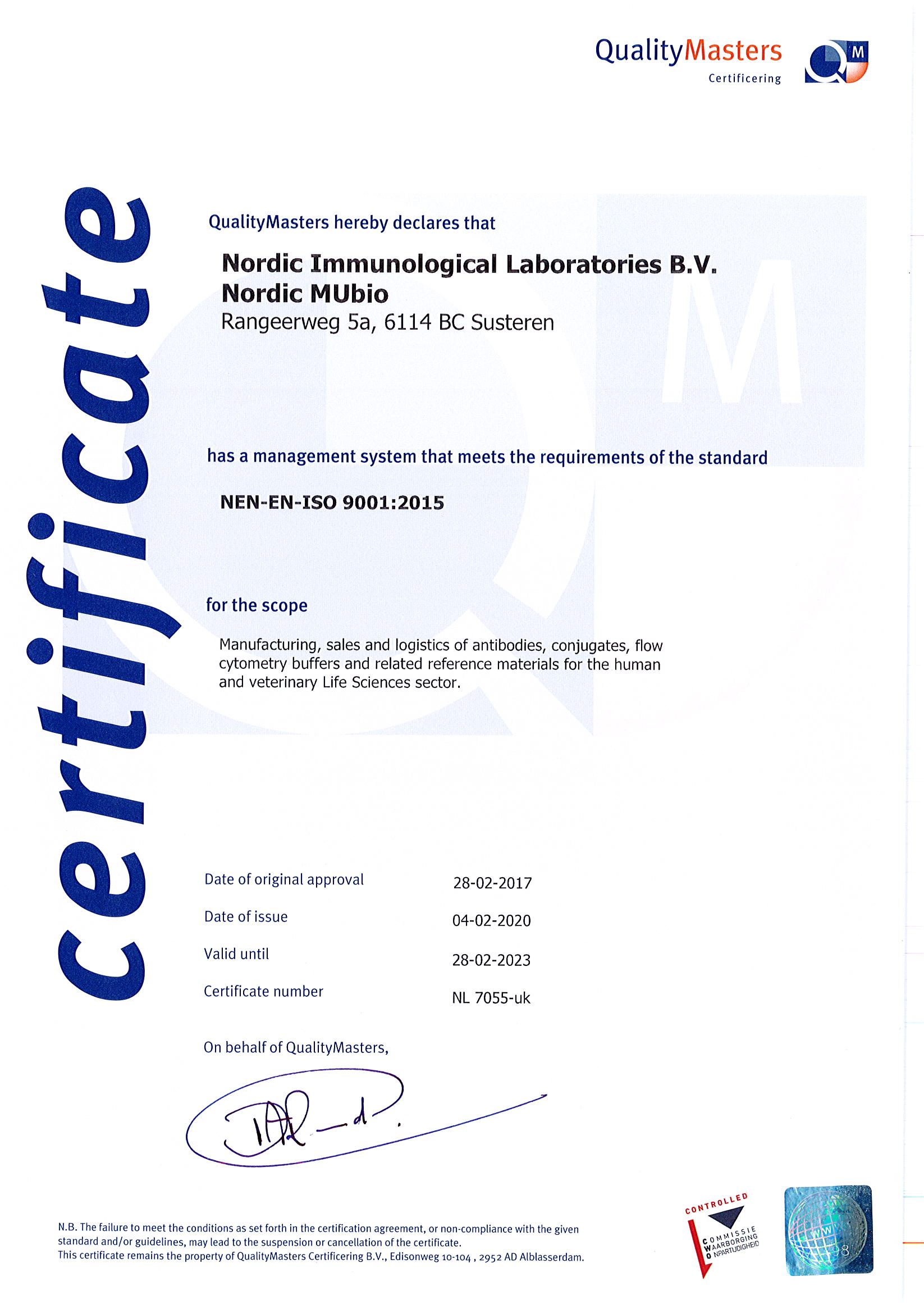 Nordic-MUbio公司供應(yīng)2000多種用于生物醫(yī)學(xué)和獸醫(yī)研究的基礎(chǔ)免疫學(xué)試劑,包括抗血清、抗體、免疫復(fù)合物、純化蛋白、對(duì)照品、血清蛋白標(biāo)準(zhǔn)品和其他校準(zhǔn)品。他們包括高度特異性的單克隆抗體,以及用于不同試驗(yàn)體系的標(biāo)記二抗。Nordic-MUbio嚴(yán)格遵守IS09001標(biāo)準(zhǔn)生產(chǎn)高質(zhì)量的抗體,80%以上的抗體經(jīng)過冷凍組織免疫組化檢測,近70%的產(chǎn)品通過流式細(xì)胞術(shù)驗(yàn)證,50%的產(chǎn)品通過WB驗(yàn)證。同時(shí)Nordic-MUbio也是斑馬魚抗體開發(fā)的引領(lǐng)者,擁有50多種可用于斑馬魚熒光檢測的抗體。Nordic-MUbio的核心優(yōu)勢在于每一個(gè)單項(xiàng)產(chǎn)品都提供及時(shí)的技術(shù)支持并擁有廣泛的科學(xué)數(shù)據(jù)、圖片和文獻(xiàn)參考資料。